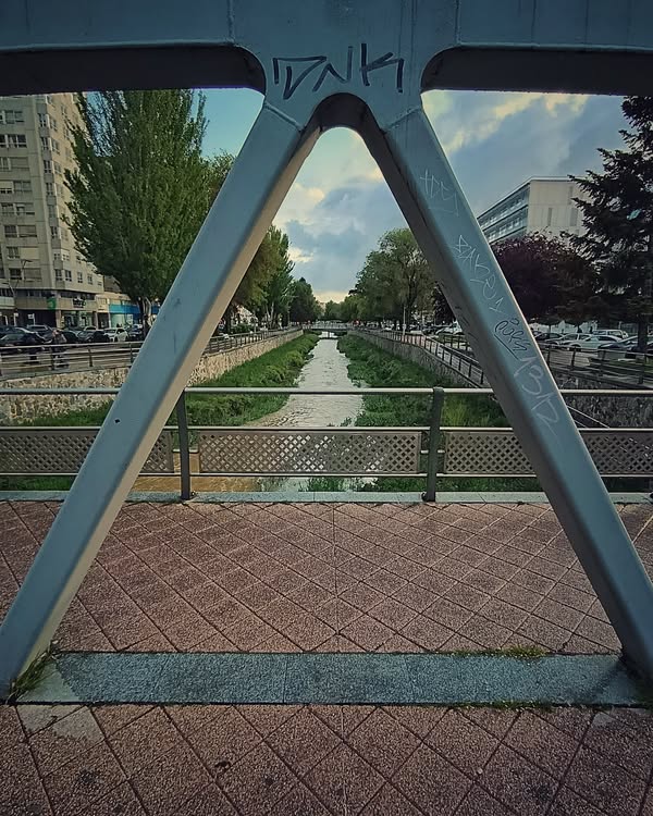 La ciudad a veces es como la miramos, es como la encuadramos y la geometría triangular de la pasarela que cruza el río Vena en la Avda. de los Reyes Católicos en la ciudad de Burgos, da para que un encuadre cuente ese tramo que ya le se acerca para que este río desemboque en el Arlanzón.
